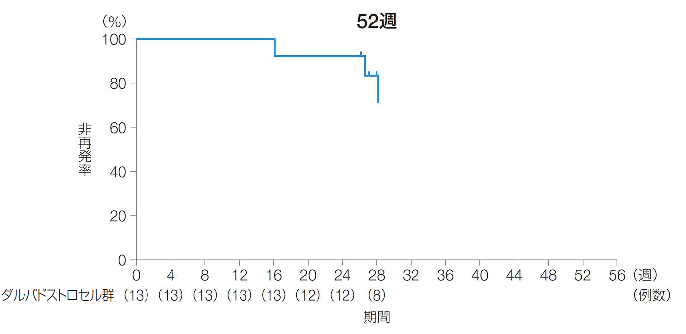 24週後及び52週後の再発率は、25.0%[90%CI:7.2, 42.8、95%CI:3.8, 46.2]及び23.1%[90%CI:3.9, 42.3, 95%CI:0.2, 46.0]であった。