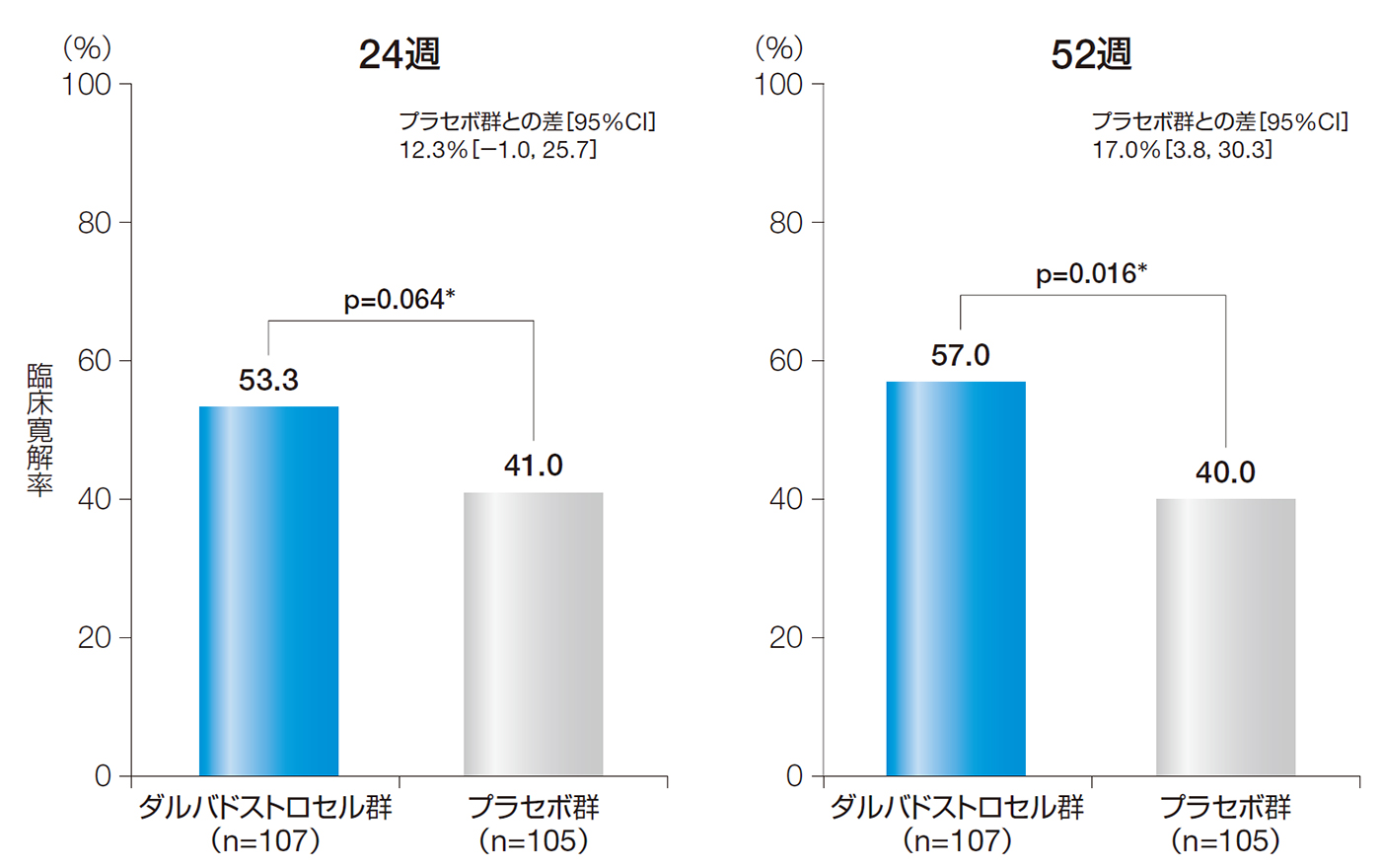 24週後及び52週後のIBDQスコアのベースラインからの変化量の平均値±標準偏差は、ダルバドストロセル群でそれぞれ3.81±25.533及び2.14±27.416、プラセボ群でそれぞれ4.01±25.562及び1.69±25.006であった。